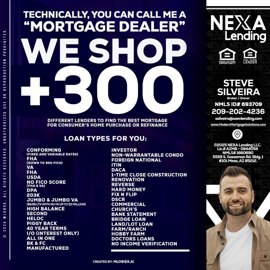 300+ LENDERS - Steve Silveira -Loan OfficerHi, my name is Steve Silveira. I’m a Loan Officer with NEXA Lending LLC., offering personalized mortgage solutions, fast customized quotes, great rates and service with integrity.