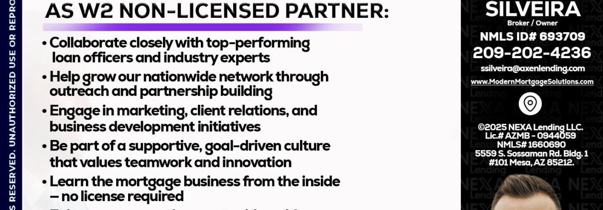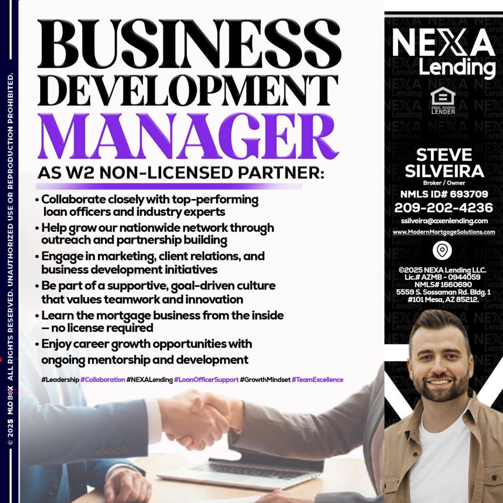 business development - Steve Silveira -Loan OfficerHi, my name is Steve Silveira. I’m a Loan Officer with NEXA Mortgage LLC., offering personalized mortgage solutions, fast customized quotes, great rates and service with integrity.